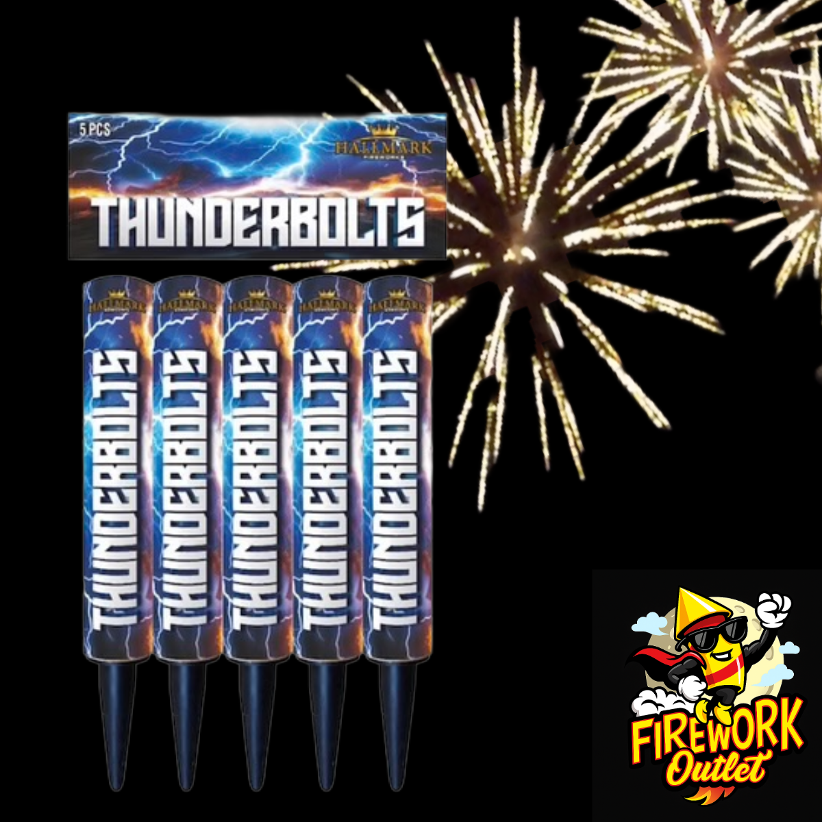 A pack of five large 1.3G single-shot Roman candles creating a dazzling variety of effects. Watch silver spinners with red strobe, red & blue stars with silver strobe, purple stars with green strobe, yellow palm bursts with silver strobe, and brocade crown bursts with red strobe light up the sky. Perfect for backyard celebrations or adding a colorful finale to any event.