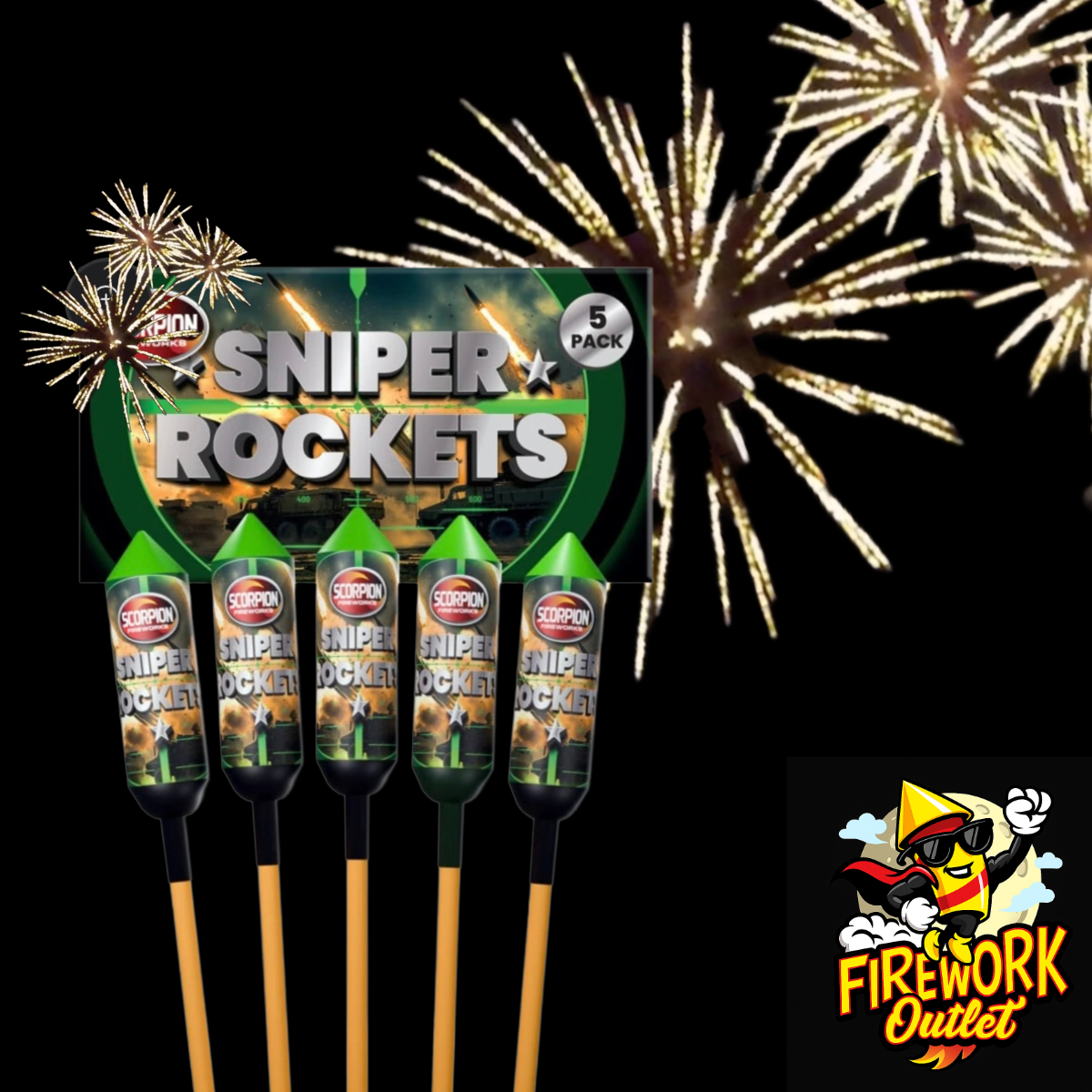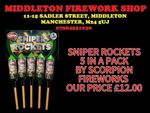 Take aim with Sniper Rockets, the 5-pack that turns the night sky into your personal fireworks battlefield! Each rocket soars with razor-sharp precision before exploding into brilliant, vivid colors that strike with maximum impact. Fast, fierce, and spectacular—these rockets make every launch a direct hit!
